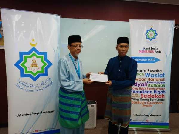 Majlis simbolik penyerahan sumbangan disampaikan oleh Setiausaha Mais Dr Ahmad Shahir Makhtar kepada Mufti Selangor Datuk Dr Anhar Opir serta Ketua Pendakwa Syarie Zainor Rashid Hassin.