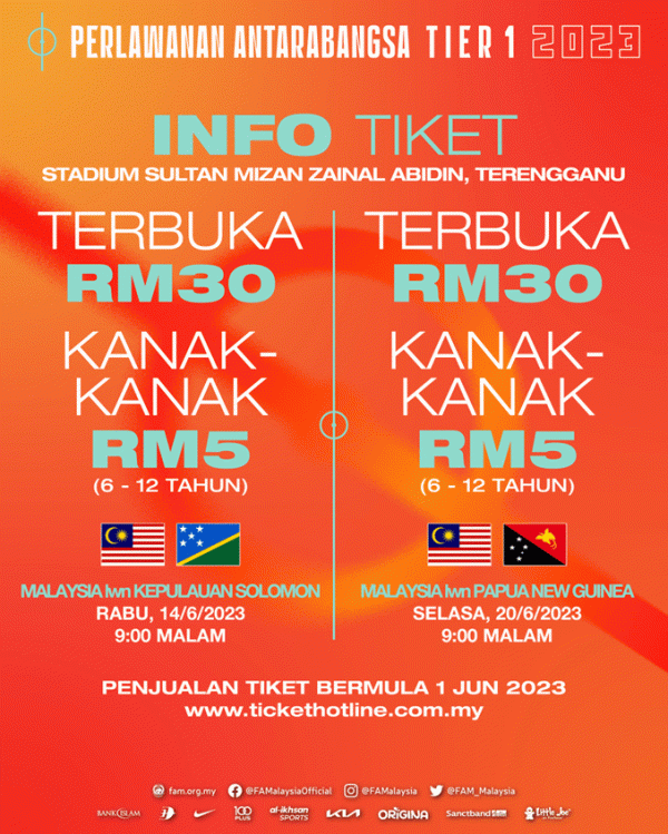KUALA LUMPUR, 1 JUN: Peminat bola sepak tanah air boleh mendapatkan tiket aksi persahabatan Tier 1 bermula hari ini, melibatkan skuad Harimau Malaya menentang Kepulauan Solomon dan Papua New Guinea di Stadium Sultan Mizan Zainal Abidin, Terengganu pada 14 dan 20 Jun.