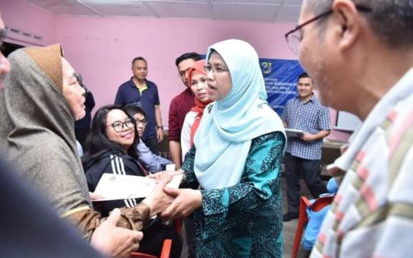 EXCO Perumahan dan Kesejahteraan Bandar Rodziah Ismail (tengah, hadapan) bergambar bersama penerima surat niat penjualan rumah penempatan sementara Desa Lembah Permai milik Majlis Perbandaran Ampang Jaya pada sesi taklimat dan penyerahan surat niat di Dewan Pinggiran Jaya, Ampang Jaya pada 5 Julai 2023. Foto Facebook Majlis Perbandaran Ampang Jaya[/caption]