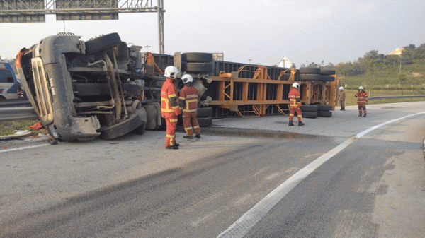 "Pasukan ini tiba di lokasi jam 5.52 petang dan kemalangan melibatkan treler jenis Scania yang membawa muatan kontena terbabas di bahu jalan," katanya.