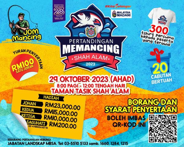 SHAH ALAM, 18 OKT: Orang ramai dijemput menyertai pertandingan memancing Shah Alam 2023 yang menawarkan hadiah wang tunai keseluruhan lebih RM50,000 di Taman Tasik Shah Alam, Ahad ini.