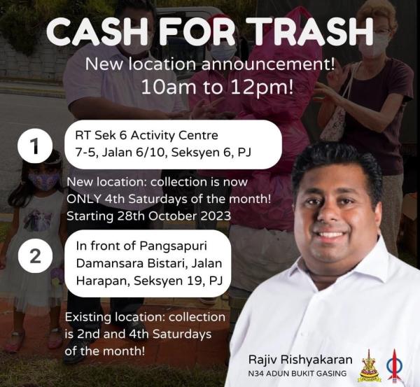 SHAH ALAM, 27 OKT: Program ‘Trash for Cash’ anjuran Pusat Khidmat Masyarakat Dewan Undangan Negeri (DUN) Bukit Gasing diperluas ke Seksyen 6 Petaling Jaya bermula esok.