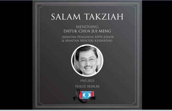 KUALA LUMPUR, 3 DIS: Bekas Menteri Kesihatan Datuk Chua Jui Meng, 80, meninggal dunia di Hospital Serdang, pukul 4.04 petang ini.