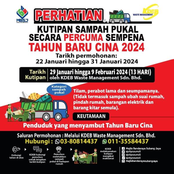 SHAH ALAM, 17 JAN: Majlis Bandaraya Subang Jaya (MBSJ) menawarkan perkhidmatan kutipan sampah pukal percuma sempena sambutan Tahun Baharu Cina.