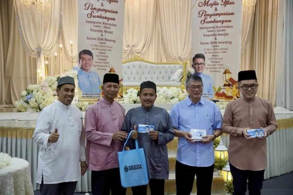 Ahli Dewan Negeri (ADN) Rawang Chua Wei Kiat (dua, kanan) menyerahkan sumbangan kepada masjid dan surau berjumlah RM36,400 pada program berbuka puasa dan penyampaian sumbangan di Dewan Orkid Kampung Melayu Batu 16, Rawang pada 17 Mac 2024. Foto Facebook Chua Wei Kiat[/caption]