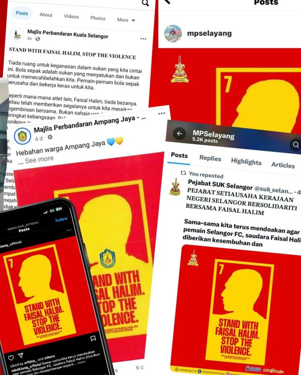 Pengurusan Selangor FC turut melancarkan kempen solidariti terhadap Faisal dengan paparan mesej sokongan pada papan iklan statik dan elektronik di setiap pihak berkuasa tempatan.