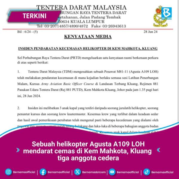 Menurut kenyataan Sel Perhubungan Raya Tentera Darat (PRTD), insiden itu melibatkan tiga anak kapal yang terdiri daripada seorang jurulatih helikopter, seorang penuntut kursus dan seorang krew kuatermaster.