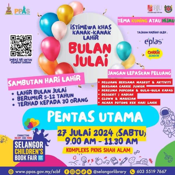 SHAH ALAM, 24 JULAI: Kanak-kanak berusia lima hingga 12 tahun yang lahir Julai berpeluang menyambut ulang tahun kelahiran mereka di Pesta Buku Kanak-Kanak Selangor, Sabtu ini.