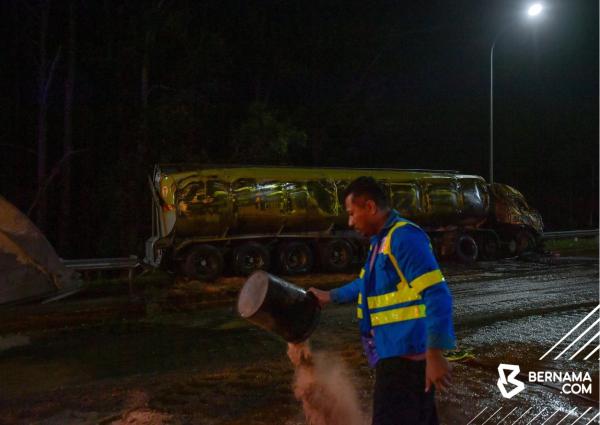 KUALA LUMPUR, 12 OKT: Pemandu lori tangki maut selepas kenderaan membawa muatan minyak sawit dipandunya hilang kawalan sebelum terbabas dan terbalik di Kilometer 27.9 Lebuhraya Kuala Lumpur-Karak menghala ke ibu negara, semalam.