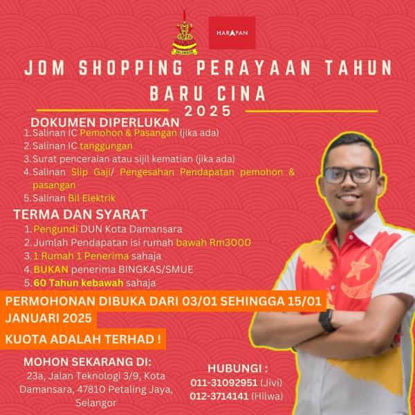 SHAH ALAM, 7 JAN: Dewan Undangan Negeri (DUN) Kota Damansara membuka permohonan baucar Jom Shopping sempena Tahun Baharu Cina.