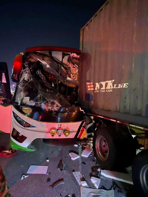 "Sebaik tiba di lokasi, bomba mendapati bas persiaran yang membawa 24 penumpang bersama pemandu serta seorang kelindan dipercayai melanggar belakang sebuah lori kontena.