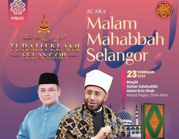 SHAH ALAM, 21 FEB: Umat Islam dijemput hadir memeriahkan Malam Mahabbah Selangor sempena Festival Turath Islami Selangor di Masjid Sultan Salahuddin Abdul Aziz Shah di sini pada 23 Februari.