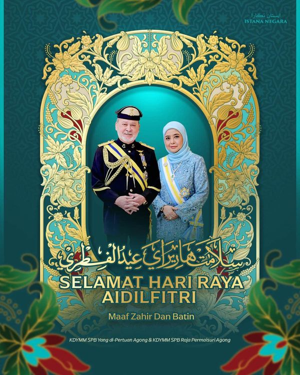 Bersempena dengan Aidilfitri yang bakal disambut esok, Seri Paduka Baginda berdua juga berharap agar ia disambut dengan penuh kesyukuran, menandakan hari kemenangan bagi umat Islam setelah mengawal hawa nafsu, mensucikan jiwa dan mengejar segala ganjaran pahala sepanjang bulan Ramadan yang penuh kemuliaan.