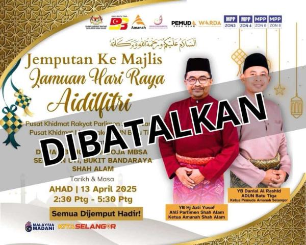 SHAH ALAM, 12 APRIL: Majlis Jamuan Hari Raya Aidilfitri Parlimen Shah Alam dan DUN Batu Tiga yang dijadual esok dibatalkan, kata Ahli Parlimen Shah Alam Azli Yusof.