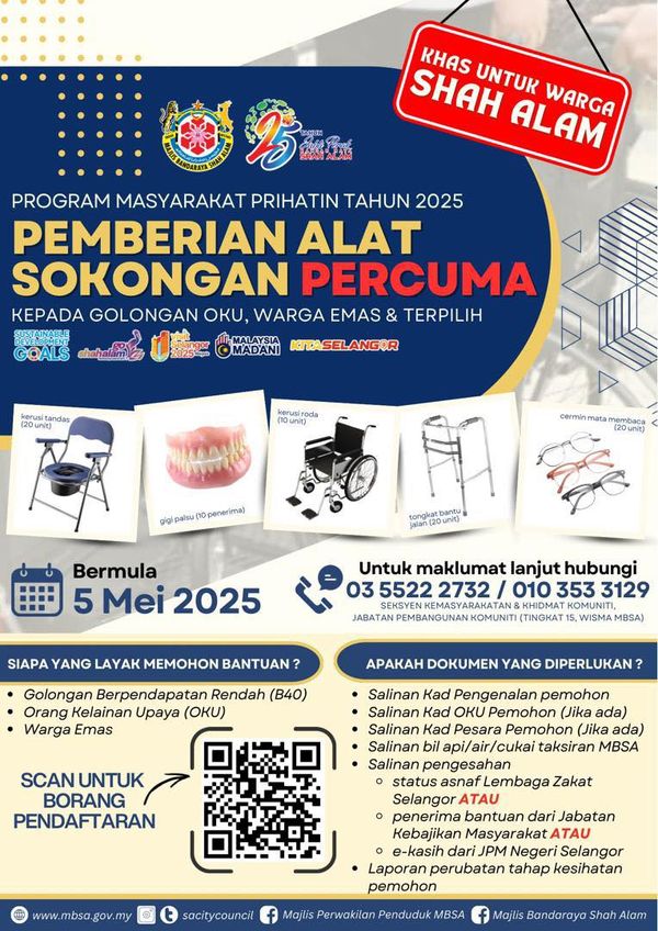 SHAH ALAM, 6 MEI: Majlis Bandaraya Shah Alam (MBSA) menawarkan pemberian alat sokongan percuma sempena sambutan ulang tahun Jubli Perak pihak berkuasa tempatan (PBT) itu tahun ini.