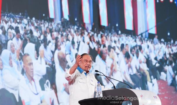 Presiden Parti Keadilan Rakyat (KEADILAN) Datuk Seri Anwar Ibrahim bersama barisan pimpinan parti baru ketika Sesi penggulugan Kongres Nasional tahunan Parti Keadilan Rakyat (KEADILAN) 2024/2025 di Persada Johor pada 24 Mei 2025. Foto NUR ADIBAH AHMAD IZAM/MEDIASELANGOR[/caption]