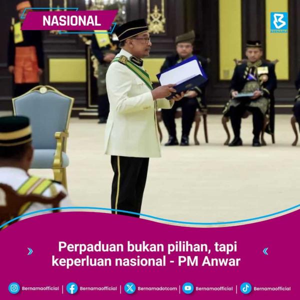 KUALA LUMPUR, 2 JUN: Perdana Menteri Datuk Seri Anwar Ibrahim hari ini menegaskan bahawa perpaduan nasional bukan lagi satu pilihan, sebaliknya menjadi keperluan utama untuk memastikan kelangsungan pembangunan negara.