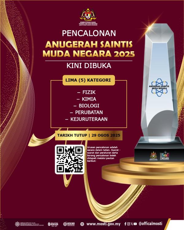 PUTRAJAYA, 8 JULAI: Kementerian Sains, Teknologi dan Inovasi (Mosti) terus komited mengiktiraf sumbangan dan kecemerlangan saintis muda dalam bidang penyelidikan dan pembangunan (R&D) Sains, Teknologi dan Inovasi (STI) menerusi penganjuran Anugerah Saintis Muda Negara (ASMN) 2025.