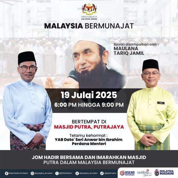 KUALA LUMPUR, 17 JULAI: Menteri di Jabatan Perdana Menteri (Hal Ehwal Agama) Datuk Dr Mohd Na’im Mokhtar mempelawa orang ramai menghadiri majlis Malaysia Bermunajat yang akan diadakan di Masjid Putra, Putrajaya pada esok.