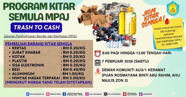 SHAH ALAM, 3 MAC: Orang ramai dialu-alukan menjual barangan terpakai di program kitar semula (Trash To Cash) anjuran Majlis Perbandaran Ampang Jaya (MPAJ) 7 Mac ini.