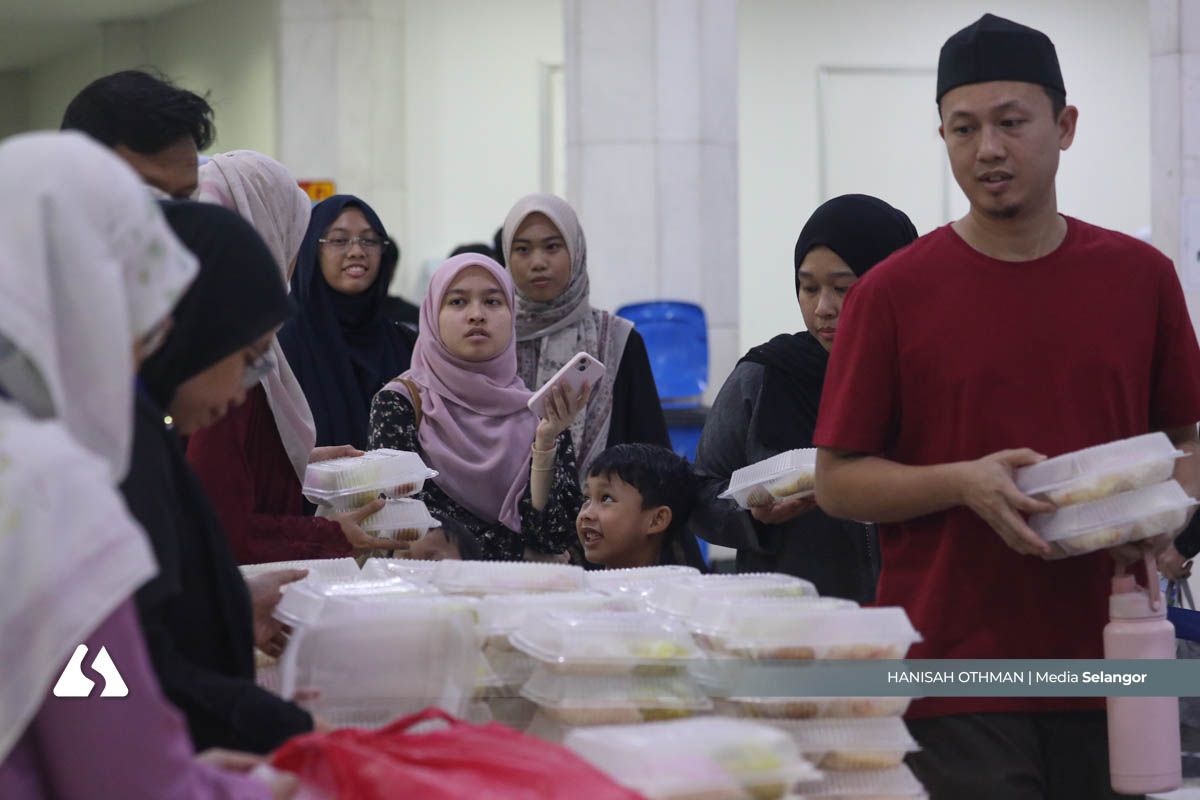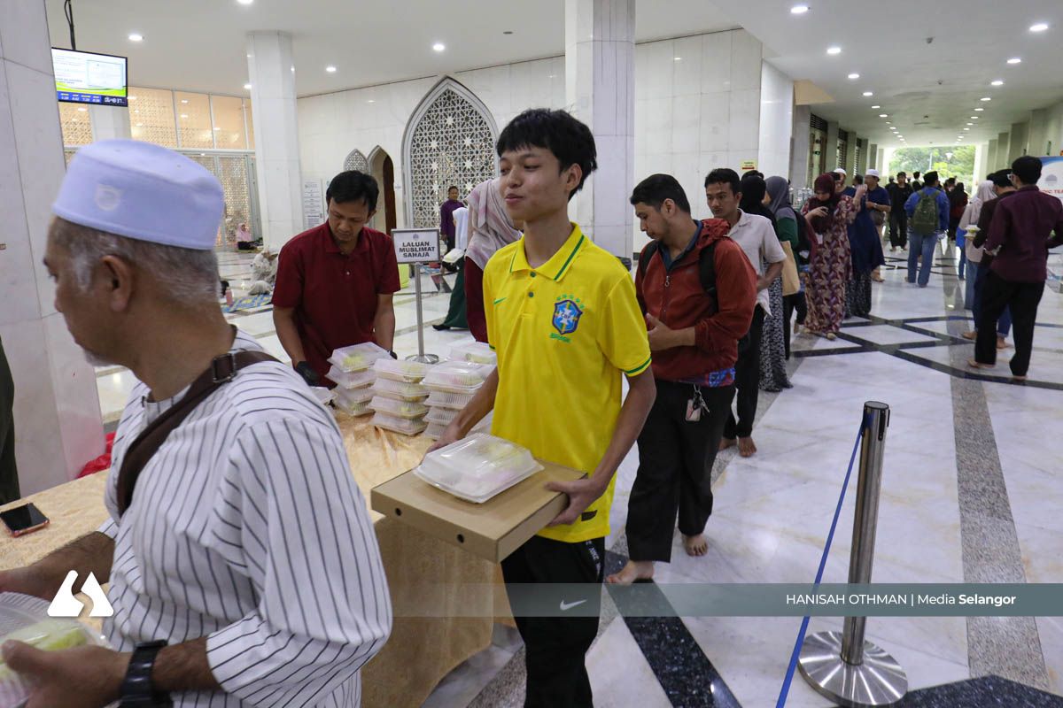 SHAH ALAM, 5 MAC: Seawal sejam sebelum waktu berbuka, barisan hampir 100 meter sudah terbentuk di dalam kawasan Masjid Sultan Salahuddin Abdul Aziz Shah — lebih dikenali sebagai Masjid Negeri — apabila jemaah sabar menunggu untuk menerima juadah berbuka puasa.