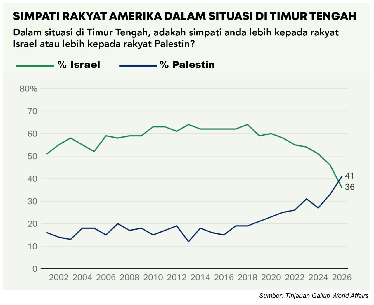 Mengukur sokongan warga Amerika Syarikat antara 2001 hingga 2025, tinjauan Gallup pertama kali mendapati 41 peratus bersimpati pada Palestin, tetapi hanya 36 peratus condong kepada Israel.