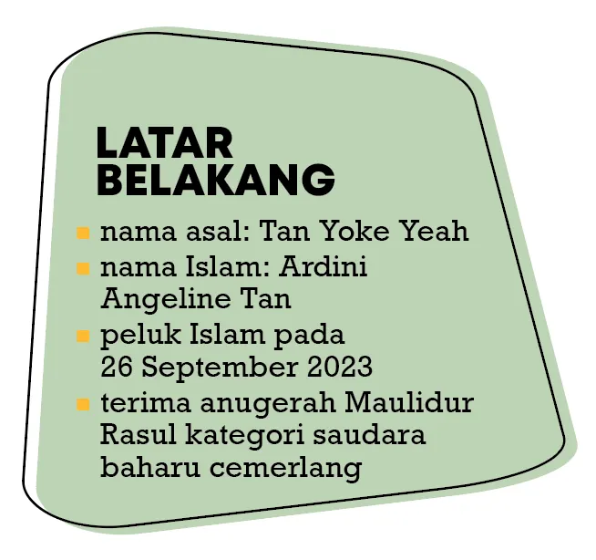 Pelakon veteran Angeline Tan menukar agama kepada Islam pada 2023 ketika berusia lebih setengah abad dan di tengah-tengah ahli keluarga yang berpegang teguh kepada ajaran Buddha.