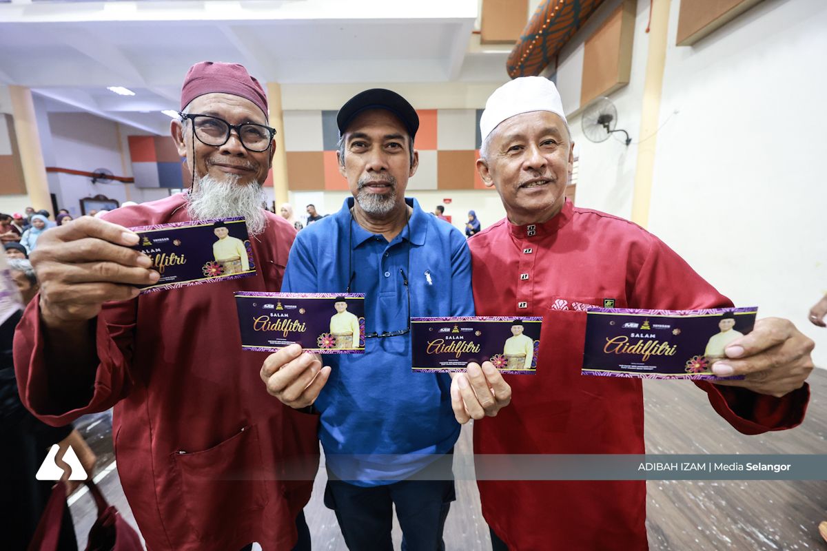 Hanafiah Yahya, 68, Zamri Sarban 61 dan Kamal Samsuri 64 menunjukkan wang sumbangan yang mereka terima ketika majlis penyerahan sumbangan hari raya kepada golongan rentan Dun Gombak Setia oleh Dato’ Menteri Besar Dato’ Seri Amirudin Shari di Dewan Beringin Sri Gombak pada 8 Mac 2026. Foto NUR ADIBAH AHMAD IZAM/MEDIASELANGOR
