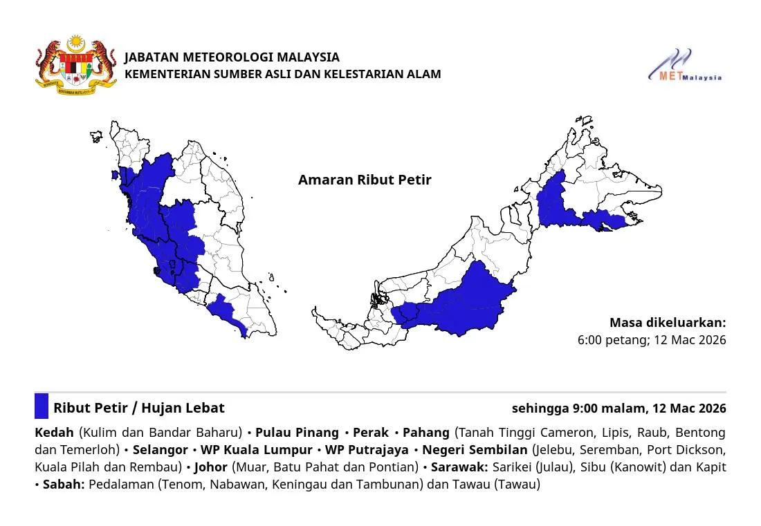 Jabatan Meteorologi Malaysia (MetMalaysia) turut mengeluarkan amaran sama melibatkan Kuala Lumpur, Putrajaya.