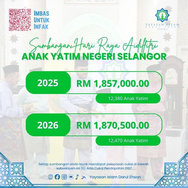 Berdasarkan rekod, RM1.85 juta sudah diagihkan kepada 12,380 anak yatim pada 2025 manakala pada tahun ini, jumlah sumbangan meningkat kepada RM1.87 juta yang memberi manfaat kepada 12,470 anak yatim.