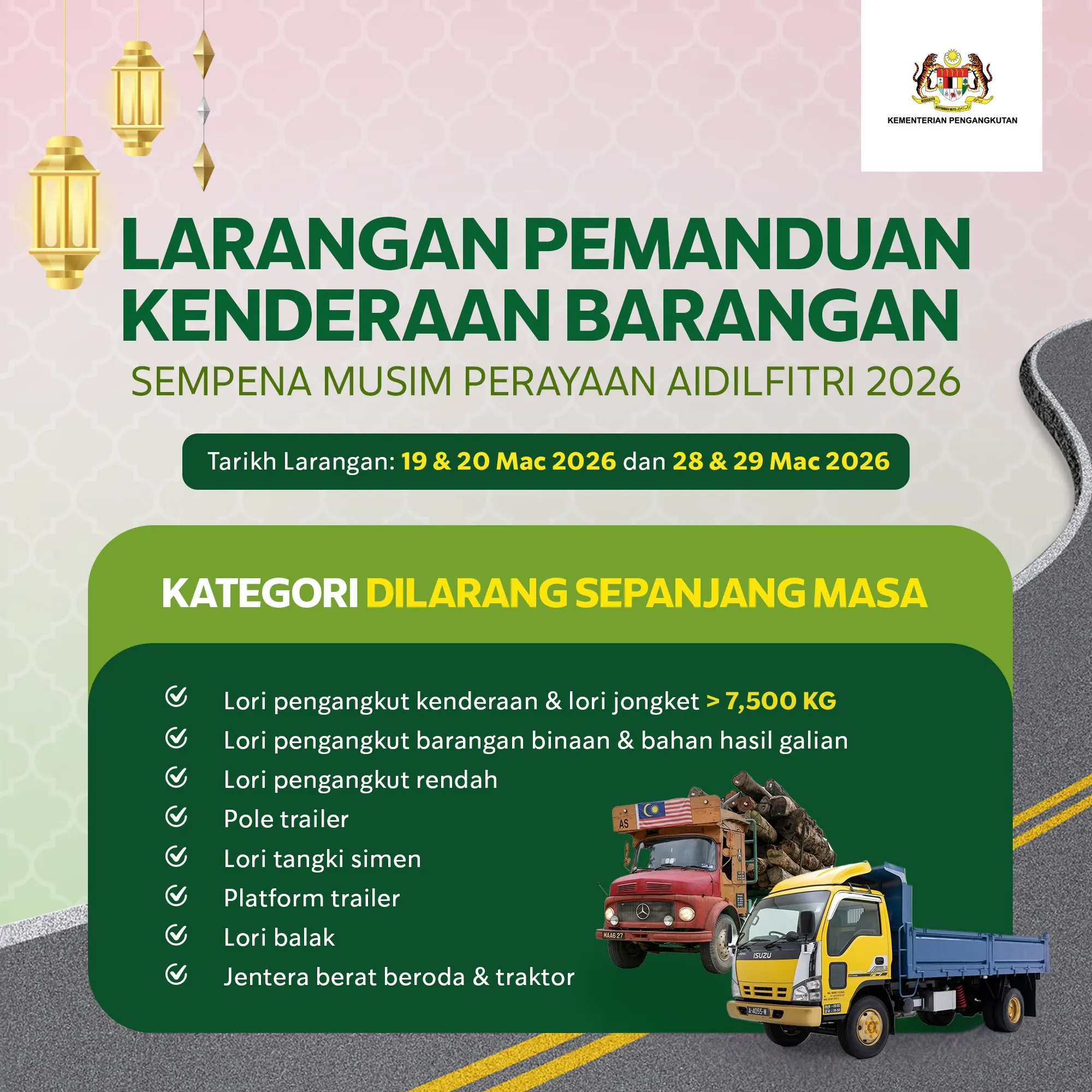 Kementerian Pengangkutan (MOT) memaklumkan larangan itu bagi memastikan kelancaran trafik, mengurangkan risiko kemalangan serta menjadikan perjalanan pulang ke kampung lebih selesa dan selamat, selaras dengan aspirasi Malaysia MADANI.