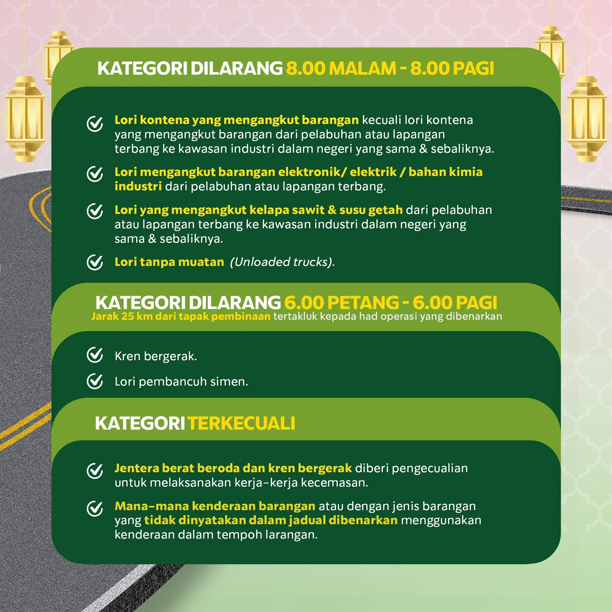 Dalam hantaran berasingan, kementerian itu memaklumkan bagaimanapun, beberapa kategori kenderaan berat dibenarkan beroperasi dengan had masa tertentu pada tarikh berkenaan antaranya lori kontena dan kargo, iaitu dari 8 pagi hingga 8 malam, manakala kenderaan pembinaan pula bermula dari 6 pagi hingga 6 petang dalam lingkungan 25 kilometer.