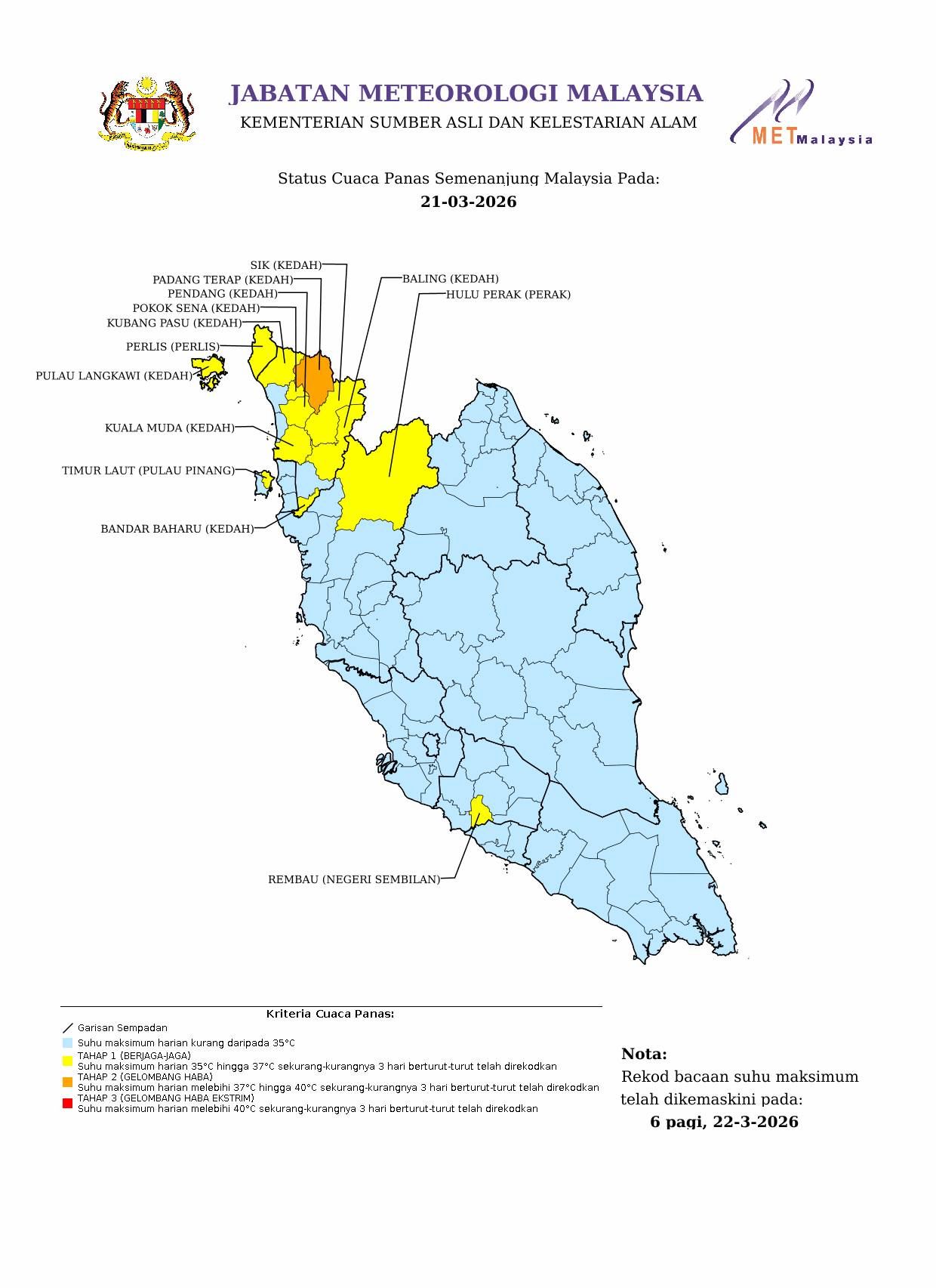 SHAH ALAM, 22 MAC: Jabatan Meteorologi Malaysia (MetMalaysia) memaklumkan satu kawasan di Semenanjung dikenal pasti berada pada Tahap 2 (gelombang haba) setakat 6 pagi tadi.