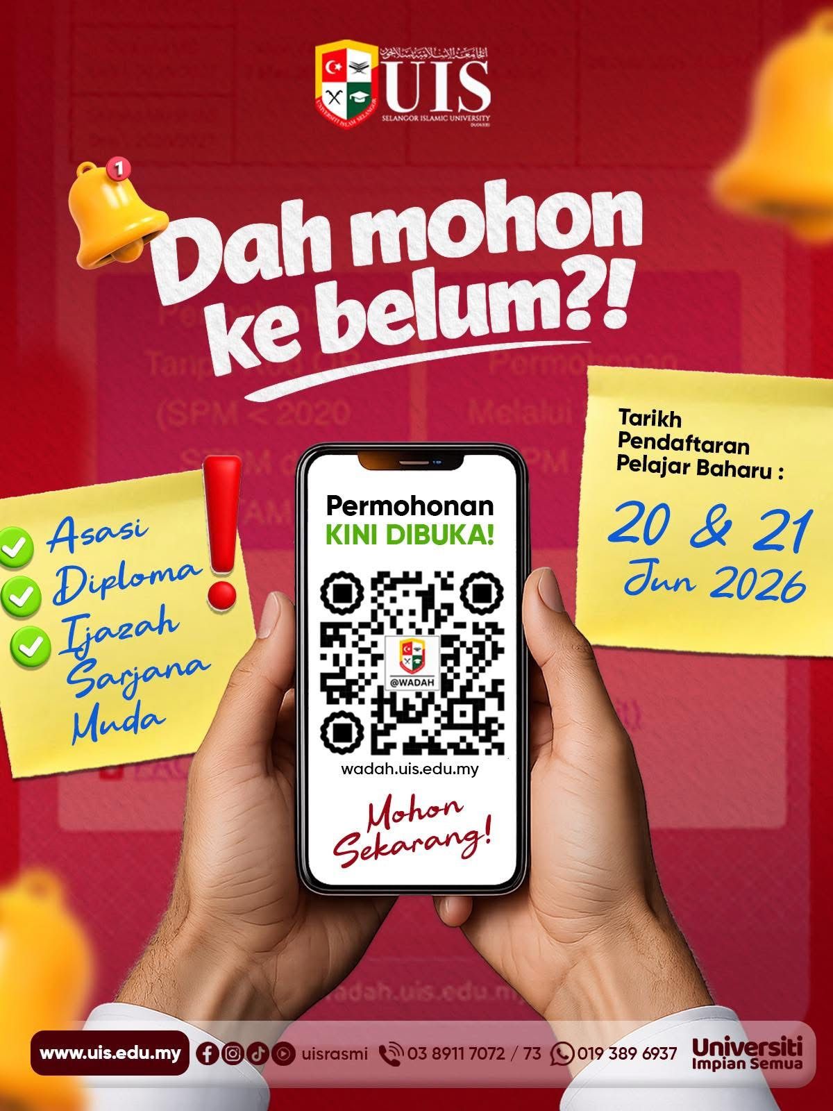Menurutnya, tarikh pendaftaran pelajar baharu pada 20 Jun dan 21 Jun ini dan permohonan boleh dibuat melalui laman web wadah.uis.edu.my atau membuat imbasan pada kod QR di poster tertera.