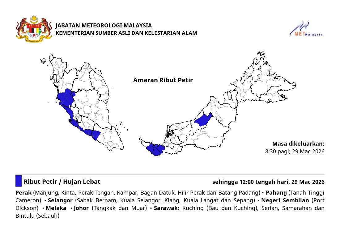 SHAH ALAM, 29 MAC: Ribut petir, hujan lebat dan angin kencang dijangka melanda lima daerah di Selangor hingga 12 tengah hari ini.
