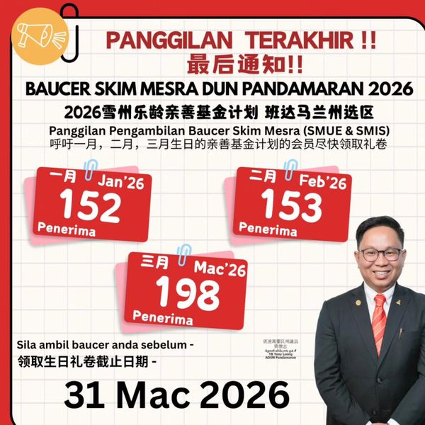 SHAH ALAM, 29 MAC: Peserta Skim Mesra Usia Emas (SMUE) dan Skim Mesra Insan Istimewa (SMIS) kelahiran Januari, Februari dan Mac di Dewan Undangan Negeri (DUN) Pandamaran diingatkan untuk menuntut baucar sebelum 31 Mac ini.