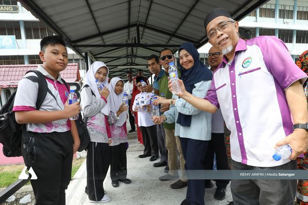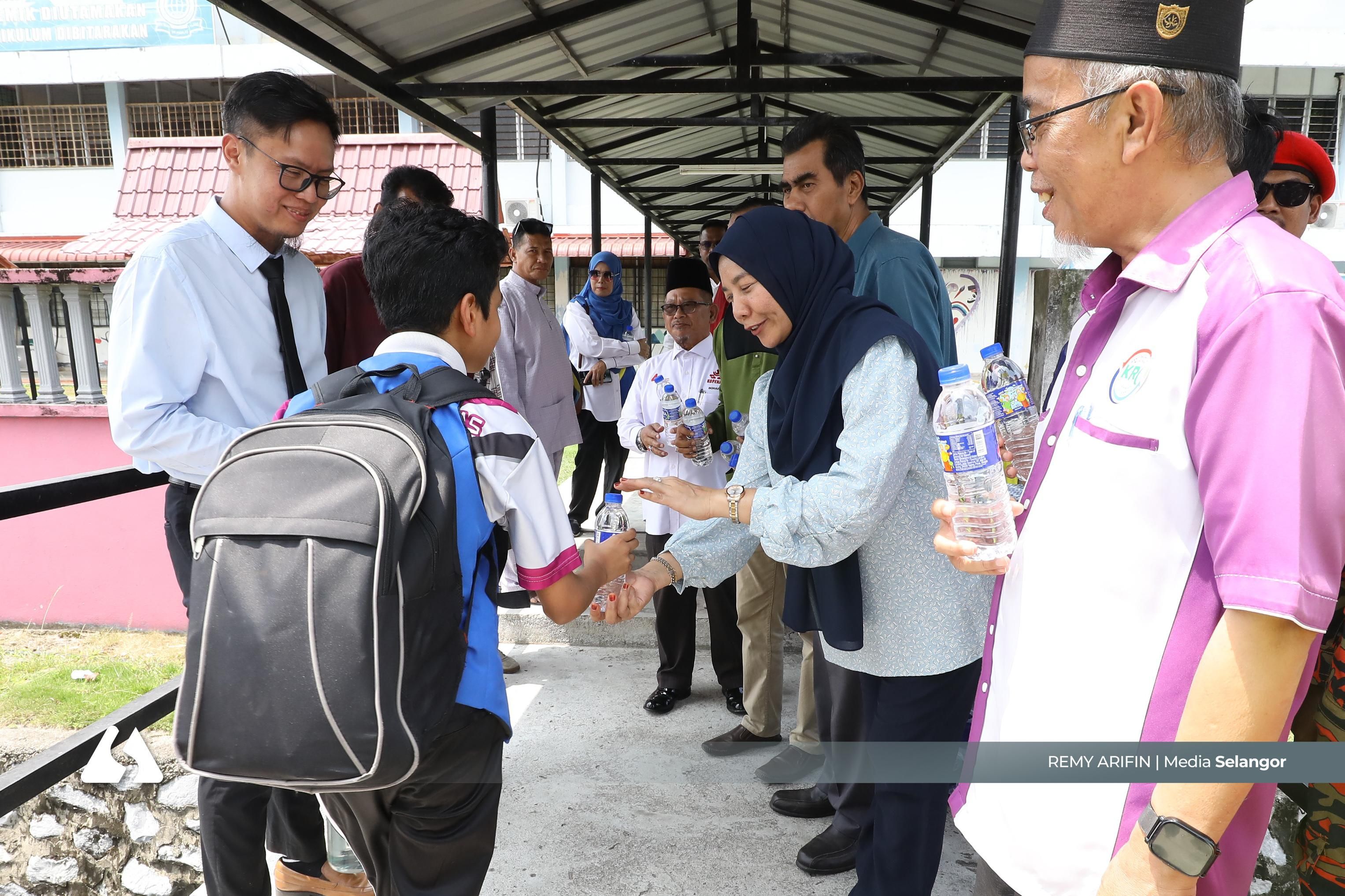 KLANG, 30 MAC: Sebanyak 1,111 botol air mineral diagihkan kepada pelajar sesi petang di Sekolah Menengah Kebangsaan (SMK) Sri Andalas hari ini, sebagai langkah mencegah risiko strok haba susulan cuaca panas.