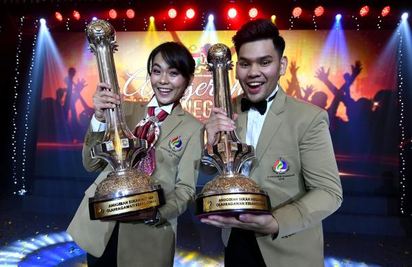 KUALA LUMPUR, 24April -- Yang di-Pertuan Agong Al-Sultan Abdullah Riayatuddin Al-Mustafa Billah Shah (tengah) berkenan bergambar kenangan bersama Olahragawan Kebangsaan Muhammad Rafiq Ismail (kiri) dan Olahragawati Kebangsaan Amy Kwan Dict Weng (kanan) pada Majlis Anugerah Sukan Negara. Turut sama Menteri Belia dan Sukan Syed Saddiq Syed Abdul Rahman (dua, kiri) dan Timbalan Menteri Belia dan Sukan Steven Sim Chee Keong (dua, kanan).fotoBERNAMA (2019) HAK CIPTA TERPELIHARA[/caption]