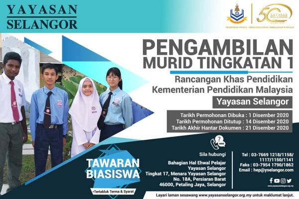 PETALING JAYA, 26 NOV: Yayasan Selangor menawarkan biasiswa antara RM700 hingga RM1,000 setahun kepada pelajar tingkatan satu bagi Program Rancangan Khas Pendidikan 2021.