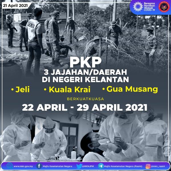 KUALA LUMPUR, 21 APRIL: Semua jajahan di Kelantan akan berada di bawah Perintah Kawalan Pergerakan (PKP) setelah tiga lagi jajahan/daerah iaitu Jeli, Kuala Krai dan Gua Musang dikenakan PKP bermula esok hingga 29 April.