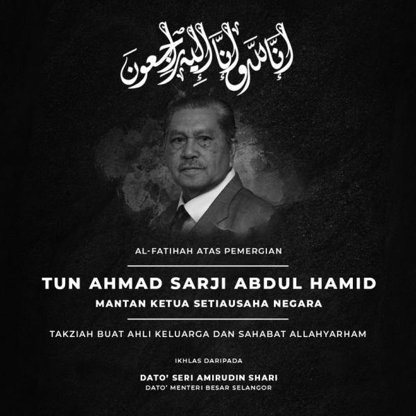 "Menerima perkhabaran dukacita Tun Ahmad Sarji Abdul Hamid, KSN kesembilan telah meninggal dunia pagi ini. Almarhum berusia 82 tahun.