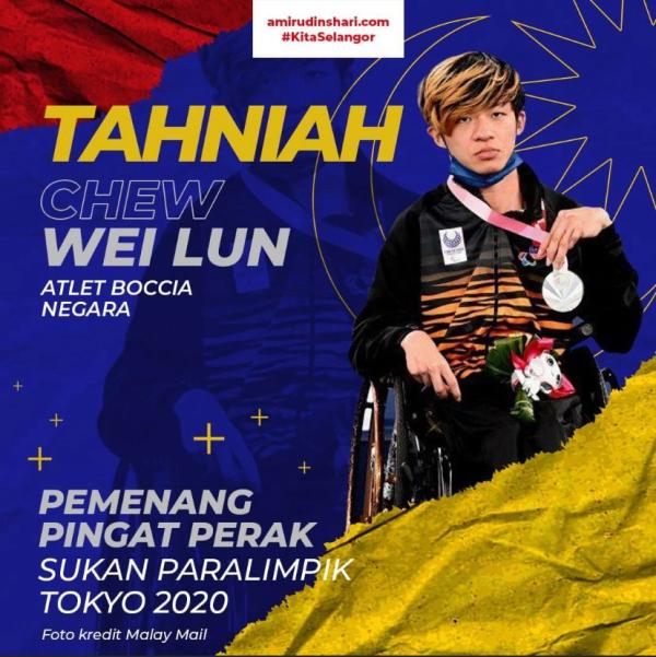 "Sekalung tahniah buat wira negara, Chew Wei Lun yang telah berjaya merangkul pingat perak Sukan Paralimpik Tokyo 2020 dalam acara Boccia kategori campuran individu BC1.