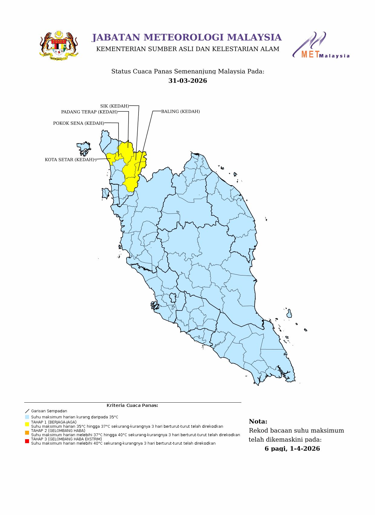 Dalam perkembangan sama, MetMalaysia turut memaklumkan beberapa daerah di Kedah sedang mengalami cuaca panas pada tahap berjaga-jaga (Tahap 1).