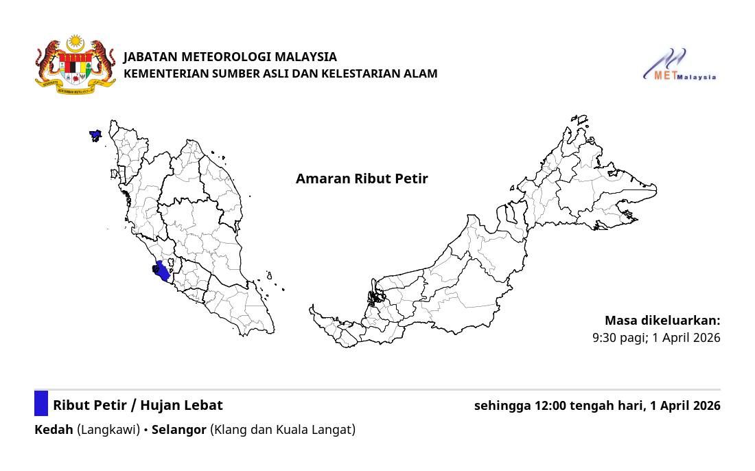 KUALA LUMPUR, 1 APR: Jabatan Meteorologi Malaysia (MetMalaysia) mengeluarkan amaran ribut petir melibatkan beberapa kawasan di Kedah dan Selangor sehingga jam 12 tengah hari ini.