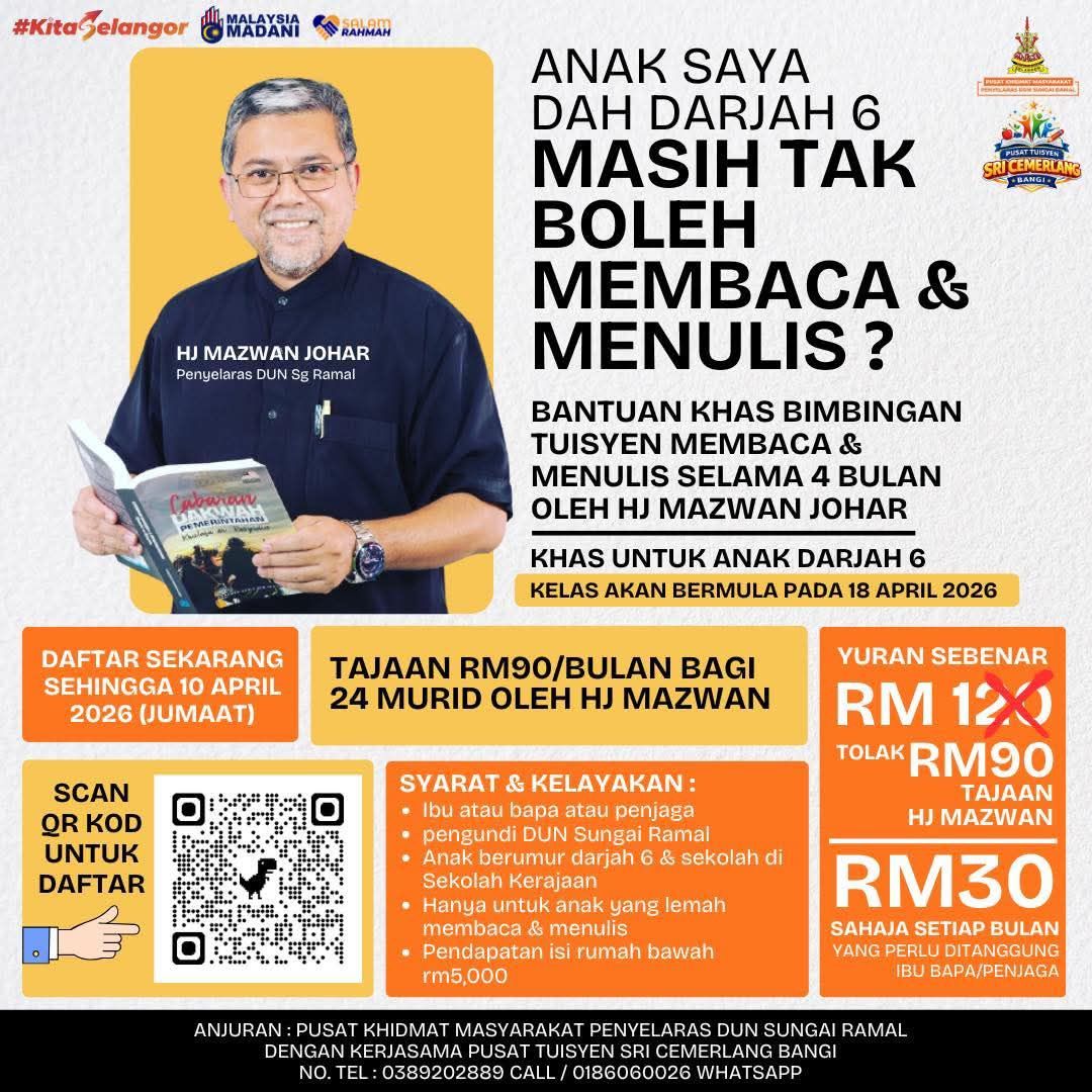 SHAH ALAM, 1 APR: Pusat Khidmat Masyarakat DUN Sungai Ramal menawarkan kelas khas bimbingan membaca dan menulis serendah RM30 sebulan bagi murid tahun enam yang masih lemah dalam asas pembelajaran.