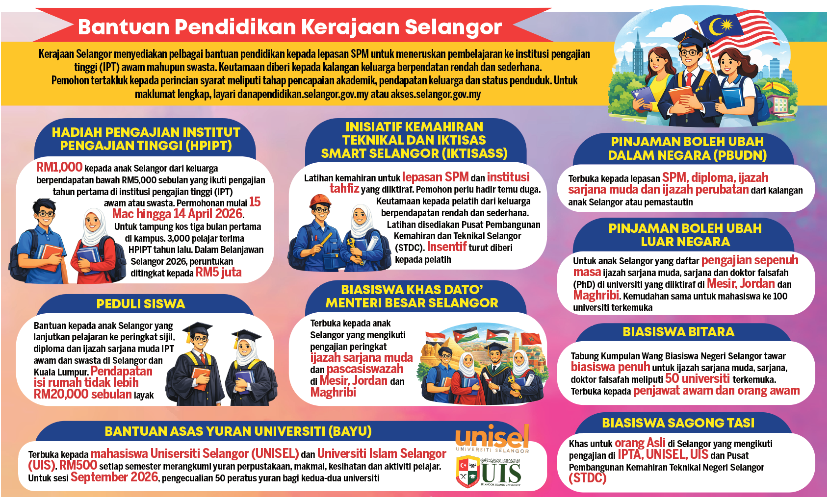 SHAH ALAM, 5 APR: Kerajaan Selangor menyediakan pelbagai inisiatif bagi membantu lepasan Sijil Pelajaran Malaysia (SPM) di negeri ini untuk meneruskan pelajaran ke peringkat tinggi.