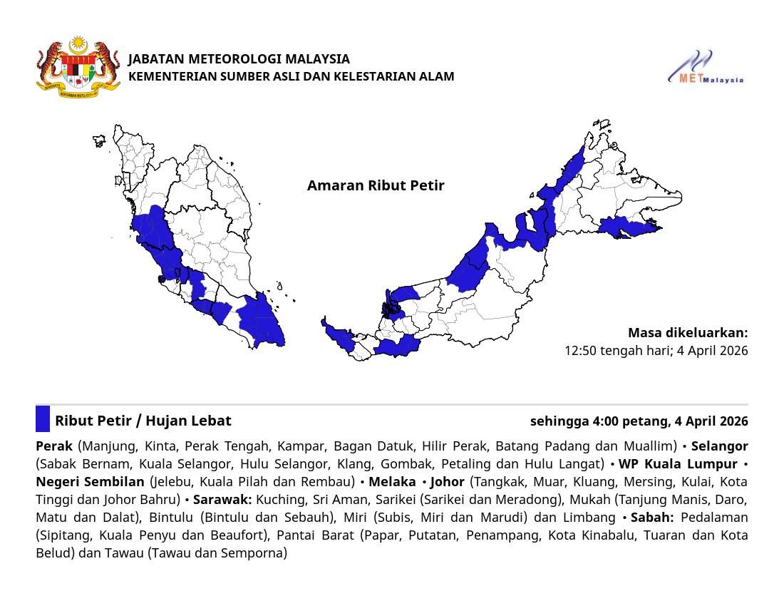 SHAH ALAM, 4 APR: Ribut petir, hujan lebat dan angin kencang dijangka melanda tujuh daerah di Selangor sehingga 4 petang ini.