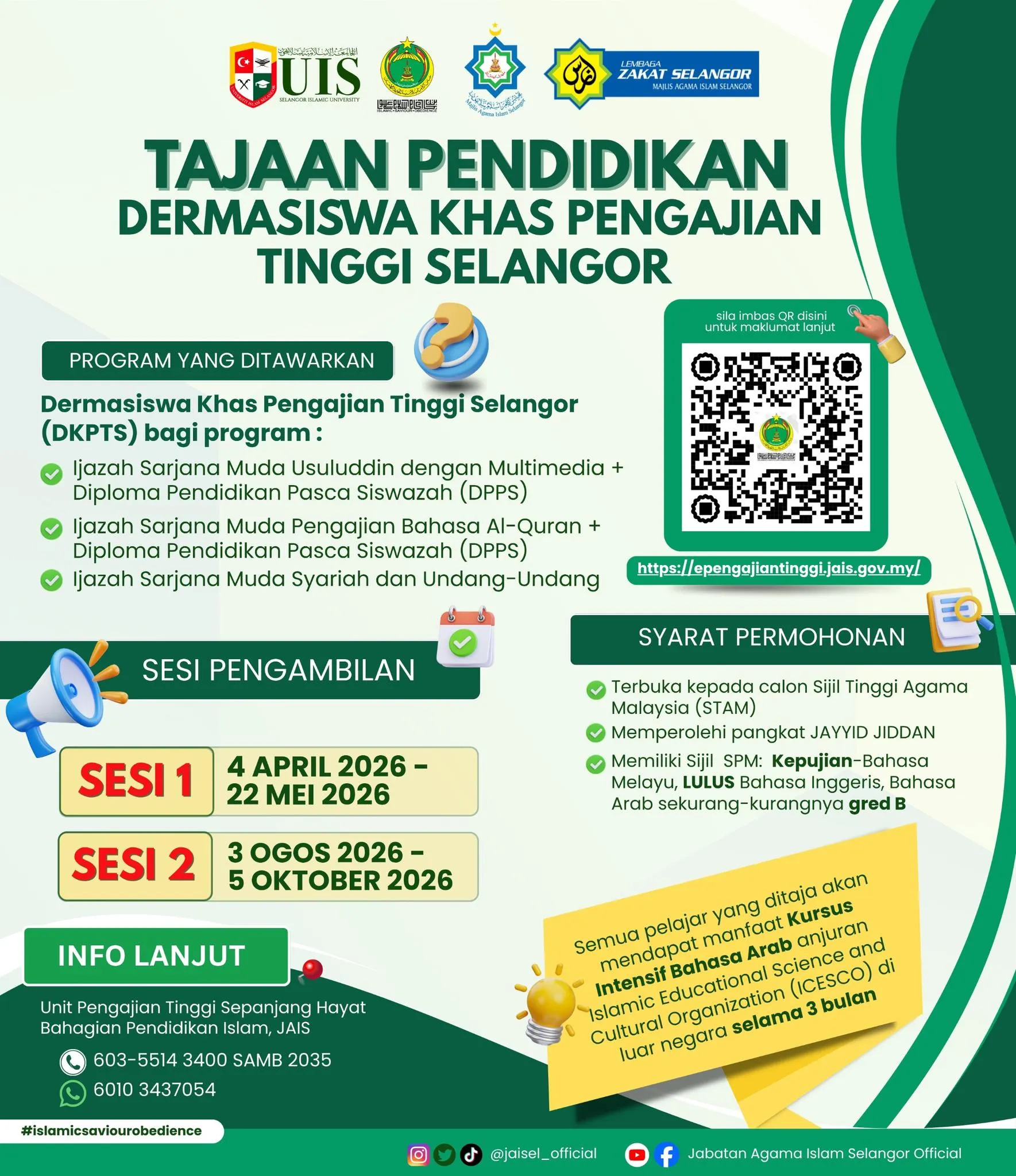 SHAH ALAM, 9 APRIL: Jabatan Agama Islam Selangor (JAIS) mempelawa pelajar lepasan Sijil Tinggi Agama Malaysia (STAM) 2025 memohon tajaan pendidikan Dermasiswa Khas Pengajian Tinggi Selangor bagi melanjutkan pengajian ke Universiti Islam Selangor (UIS).