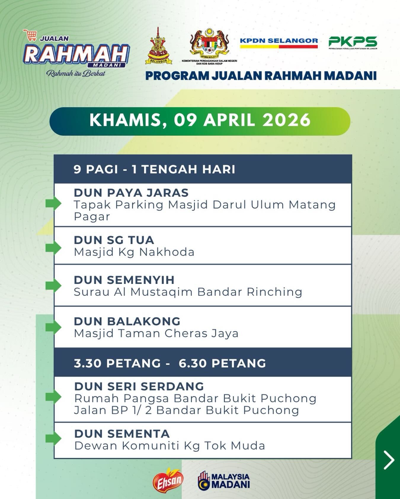 SHAH ALAM, 9 APRIL: Program Jualan Ehsan Rahmah (JER) yang dijayakan Kementerian Perdagangan Dalam Negeri dan Kos Sara Hidup (KPDN) dengan kerjasama strategik Perbadanan Kemajuan Pertanian Selangor (PKPS) diteruskan di enam lokasi hari ini.