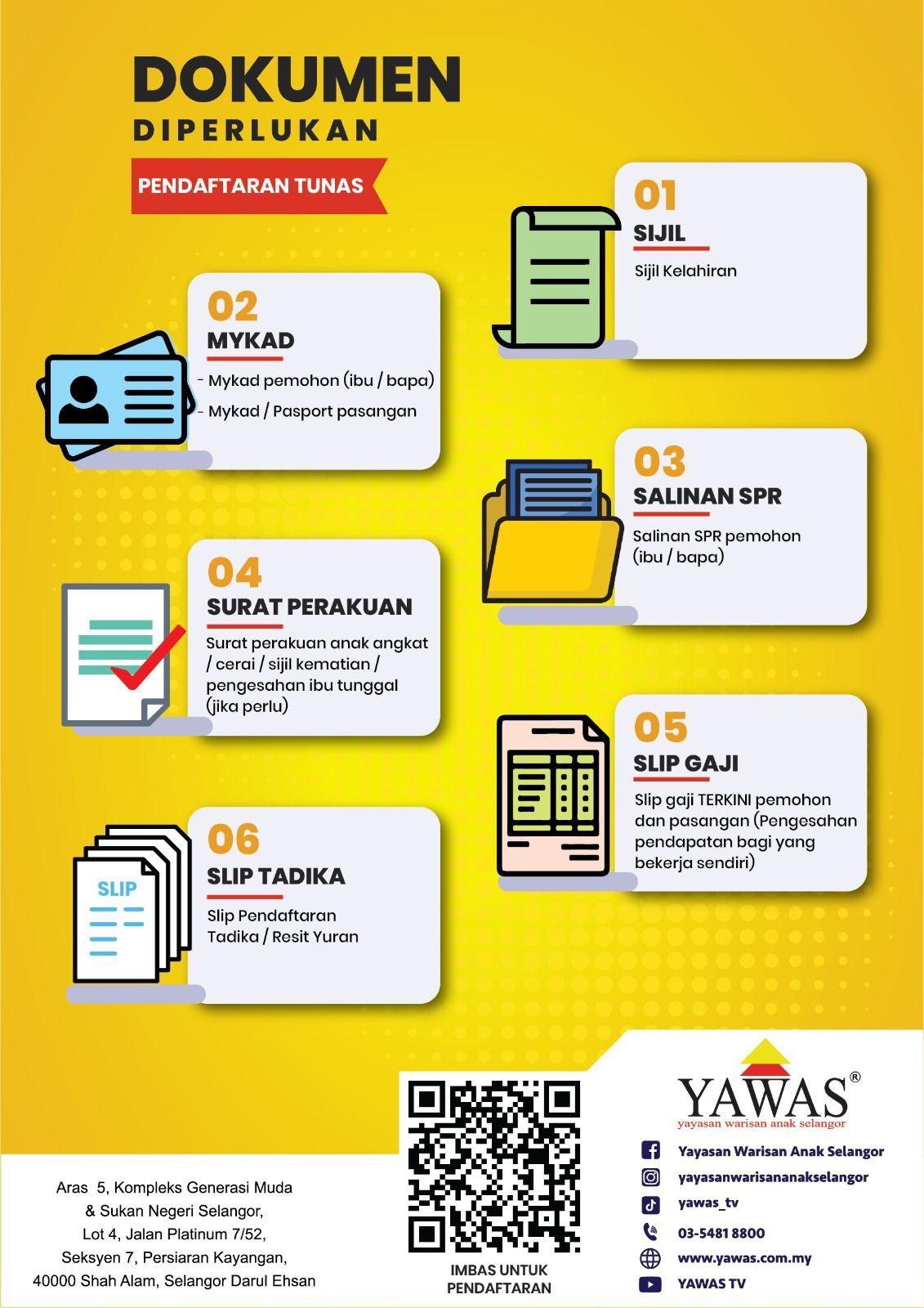 Semua dokumen hendaklah dimuat naik ke dalam sistem semasa permohonan dibuat dan tiada penghantaran dokumen fizikal diperlukan ke pejabat YAWAS.